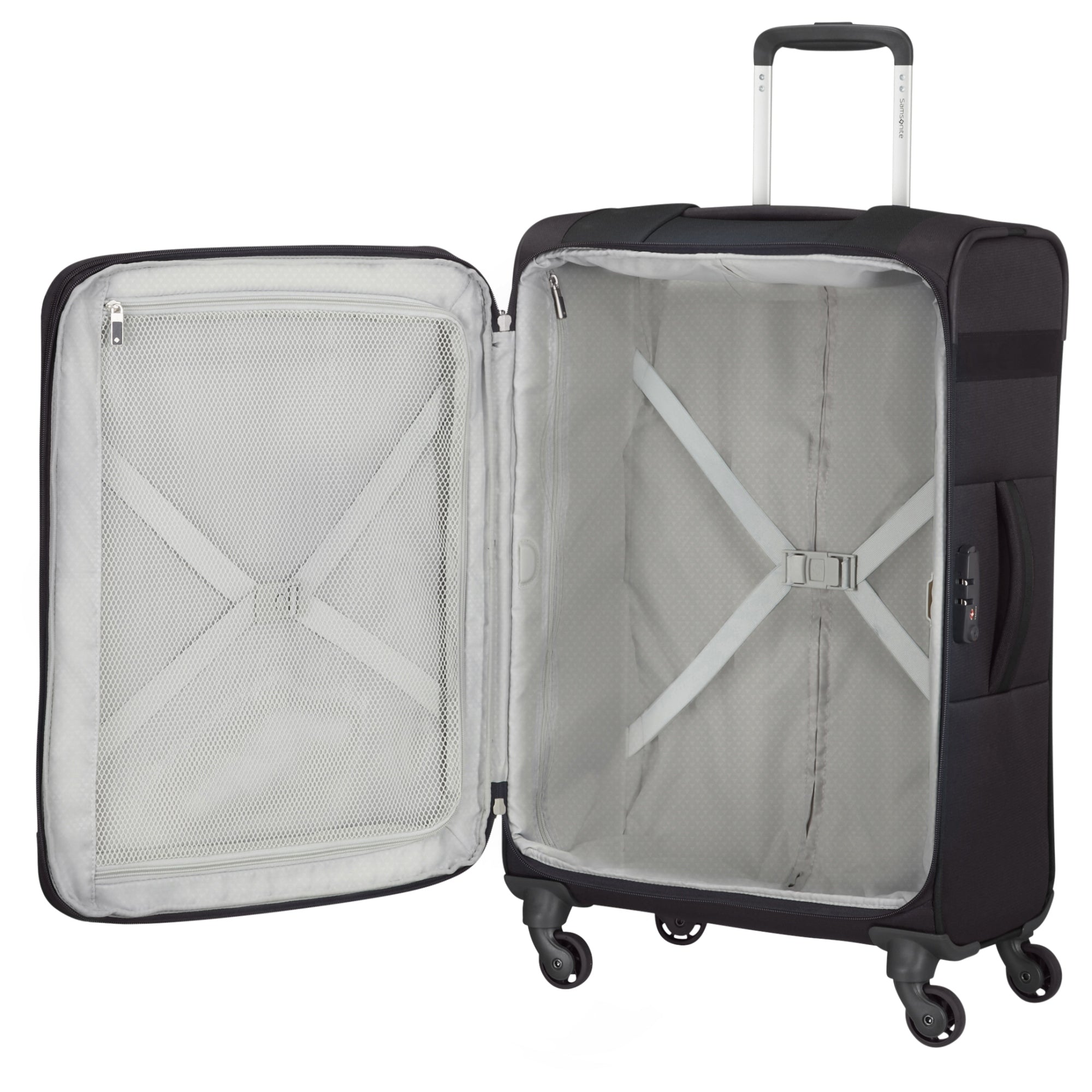 - Innenraum – mit gemustertem Polyesterfutter, einem Hauptfach, Reißverschlussfach und Kreuzspanngurten für knitterfreies Verstauen