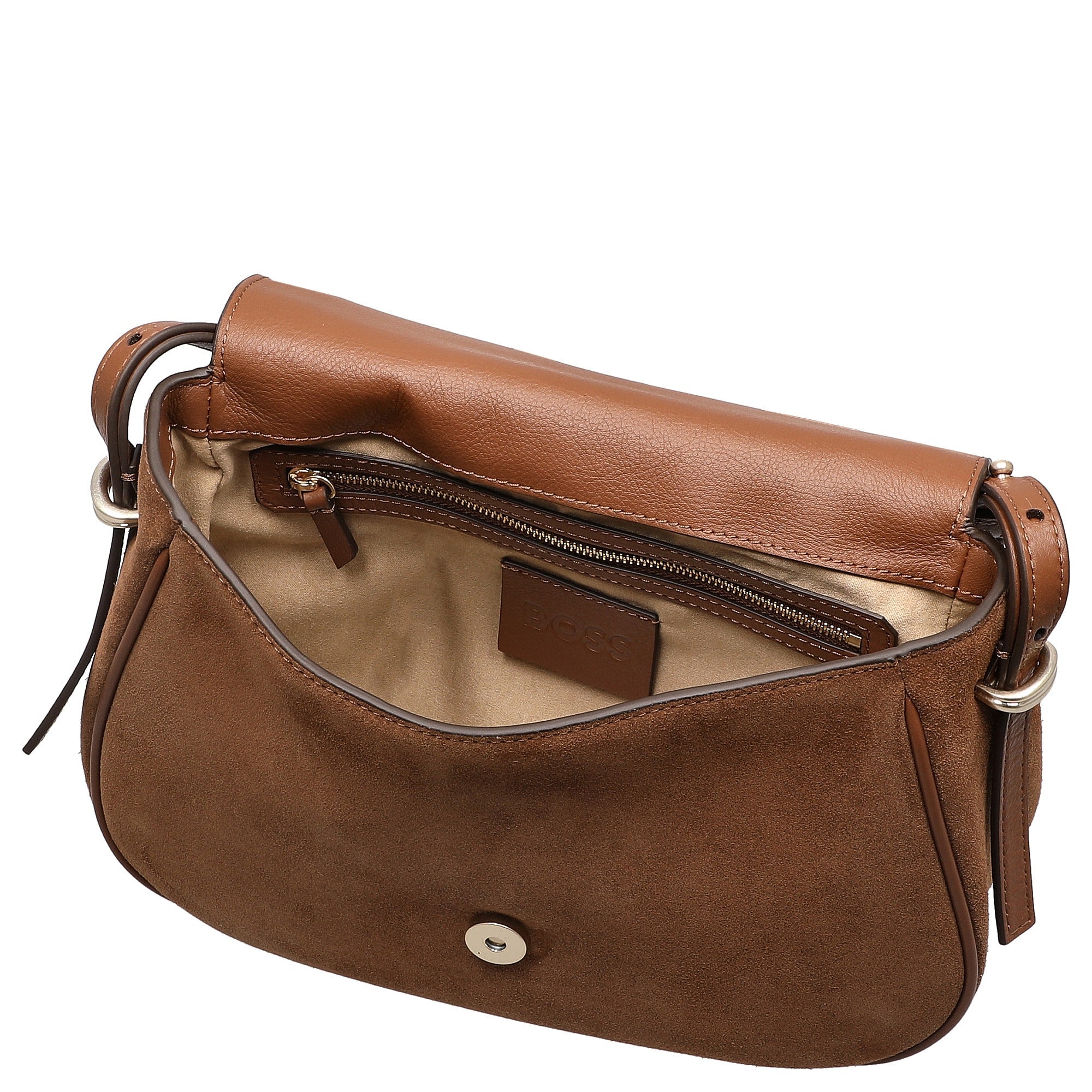 Le sac bandoulière BOSS Beyond Saddle S en élégant marron moyen est un compagnon raffiné pour les femmes soucieuses de la mode et attachées aux détails de qualité.