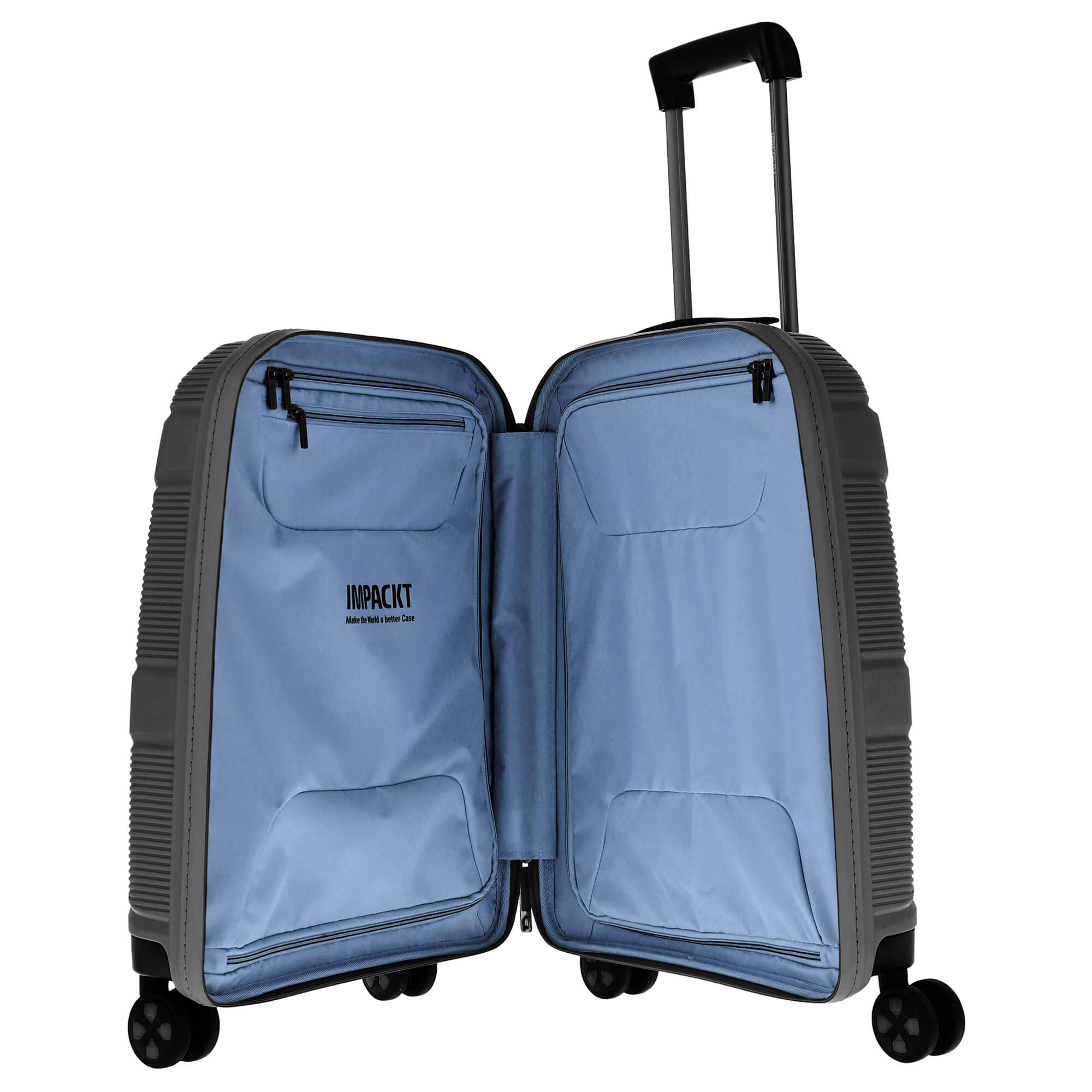 Découvrez le trolley cabine à 4 roues Impackt IP1 dans la couleur élégante Iron Grey, qui séduit non seulement par son design moderne, mais aussi par sa fabrication durable à partir de matériaux recyclés. Ce trolley est le choix parfait pour les voyageurs soucieux de l'environnement qui attachent de l'importance à la fonctionnalité et au style.