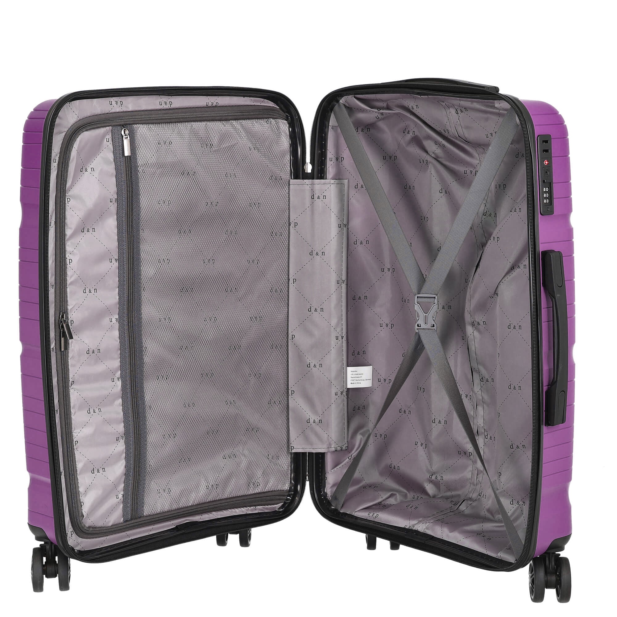 Découvrez le D&N Travel Line 4300 - Trolley 4 Roues M dans la couleur élégante violet. Ce trolley allie style et fonctionnalité et est le compagnon idéal pour vos voyages. Avec un poids de seulement 3,60 kilogrammes et un volume généreux de 63 litres, il offre suffisamment d'espace pour tous vos accessoires de voyage.