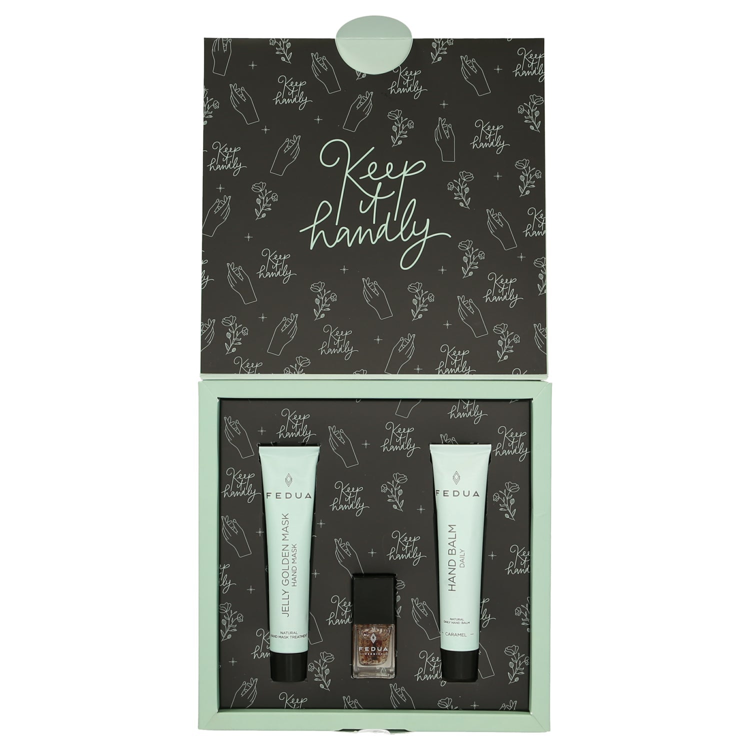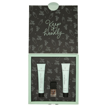 Intérieur : Chaque produit est soigneusement sélectionné et offre un soin ciblé pour vos mains, tandis que l'emballage élégant fait de ce set un véritable accroche-regard.