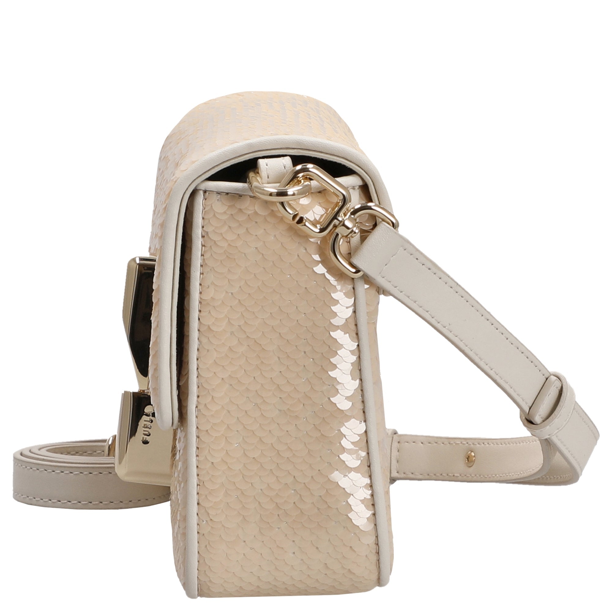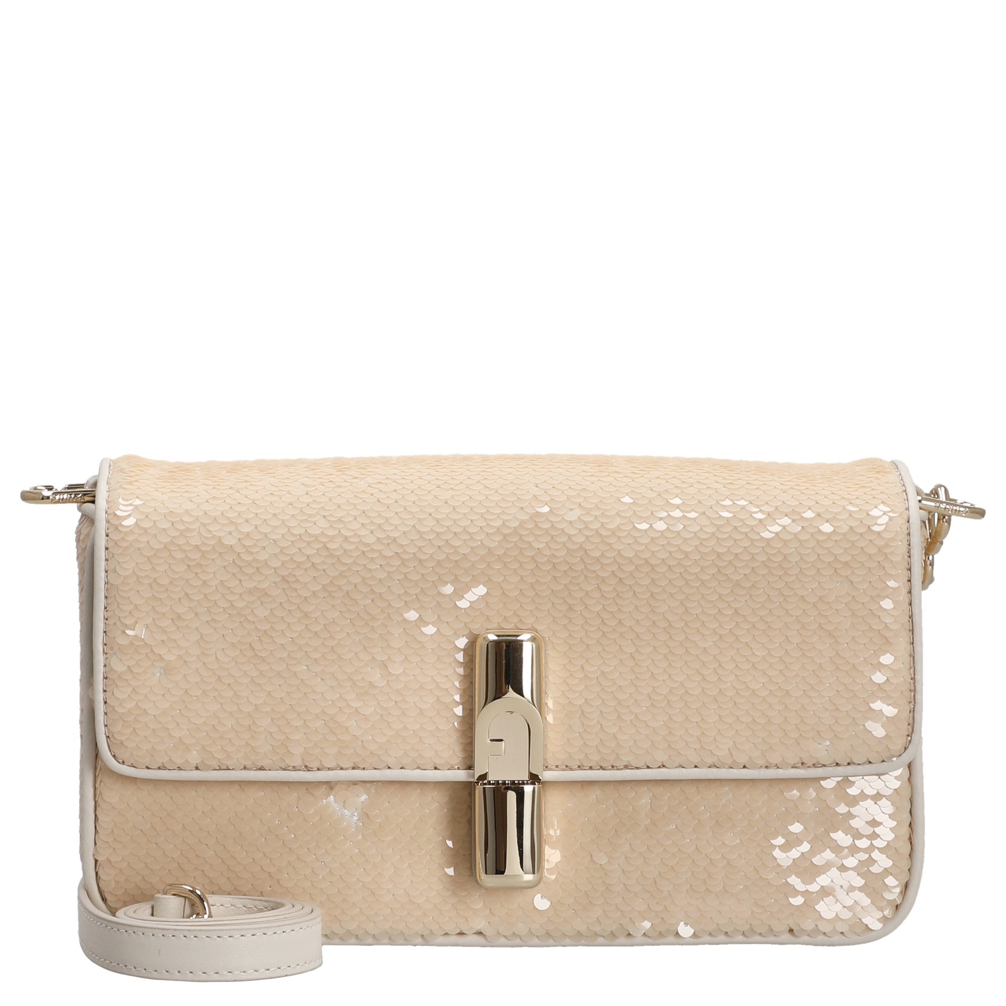 Die Furla Iride S Umhängetasche in elegantem panna besticht durch ihr zeitgenössisches Design und die schimmernde Oberfläche aus beschichtetem Stoff mit glitzernden Pailletten. Sie ist ein stilvoller Begleiter für modebewusste Frauen, die Wert auf hochwertige Details und vielseitige Trageoptionen legen.