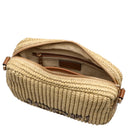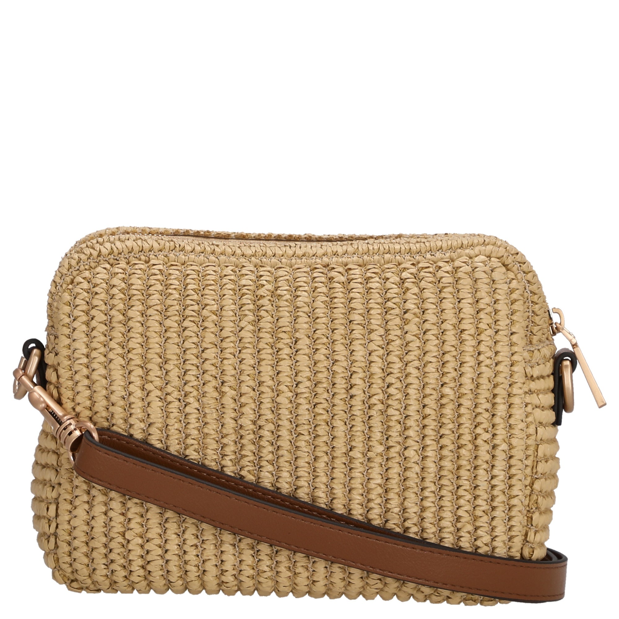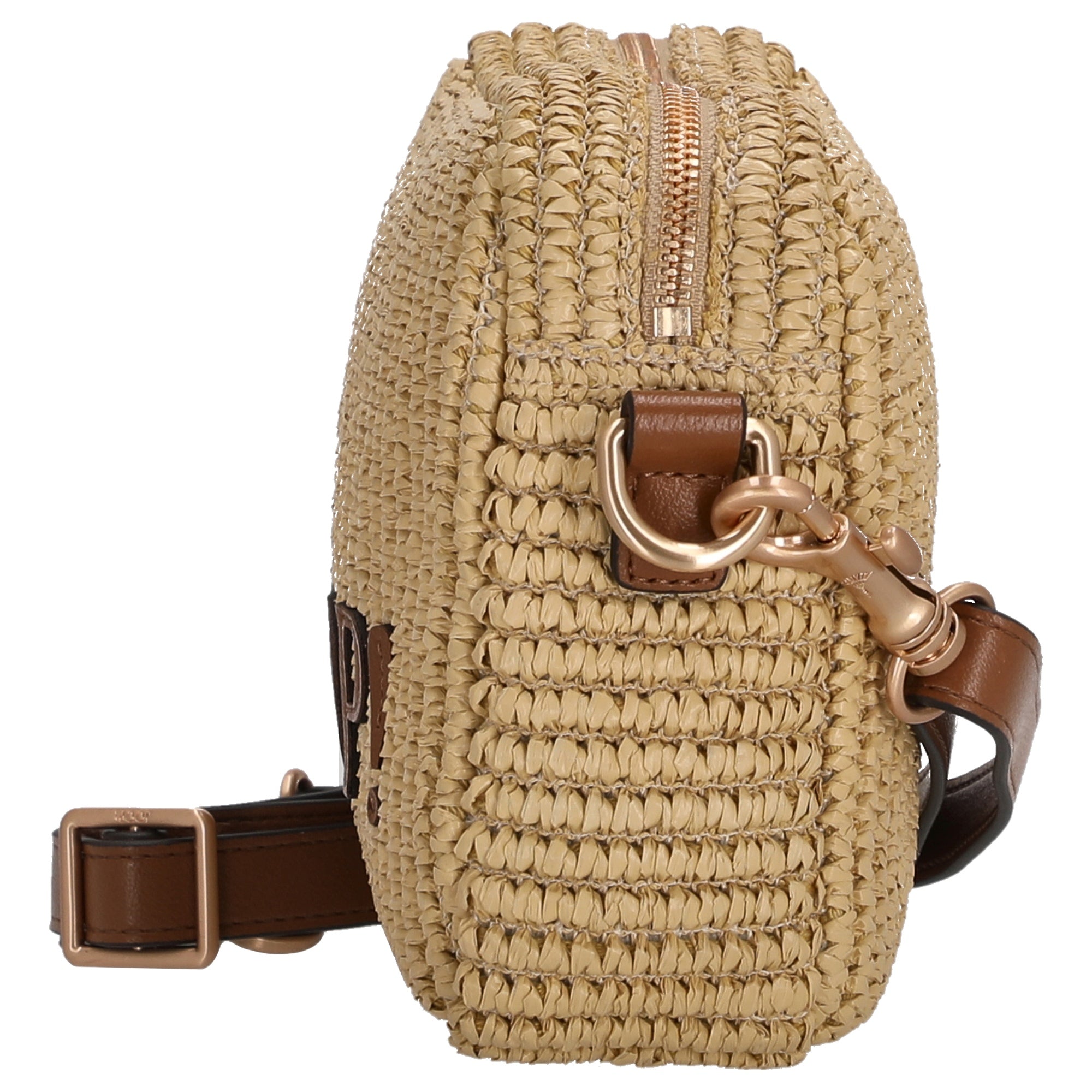 - Matériau et apparence – matériau tressé avec des applications en Cognac pour un style structuré et naturel