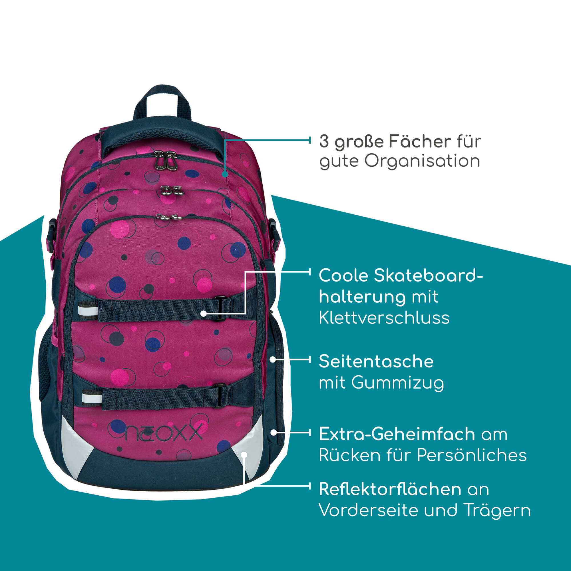 Découvrez le Neoxx ACTIVE PRO Sac à dos scolaire dans la couleur attrayante Bubble me around, qui convient parfaitement aux élèves à partir de la 5e classe. Ce sac à dos allie un design élégant à des matériaux durables et un système de portage ergonomique bien pensé, garantissant un confort optimal.