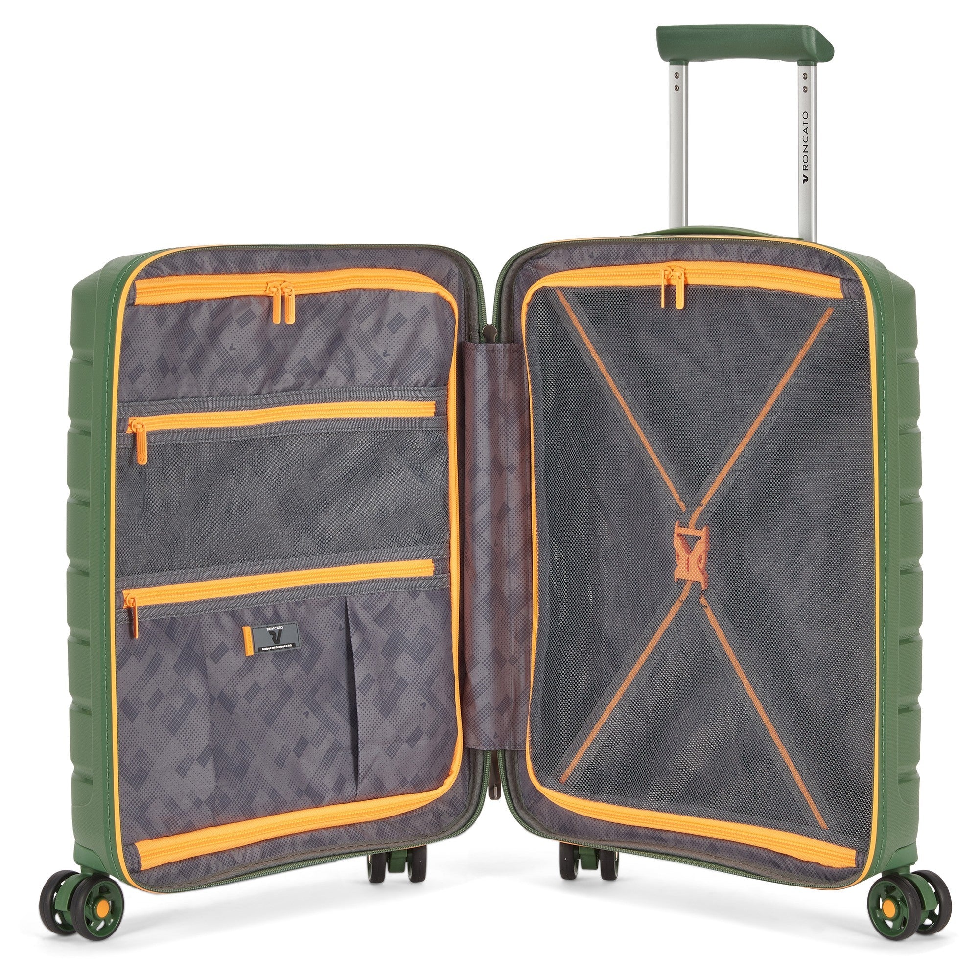 Découvrez le Roncato B-Flying Neon trolley cabine à 4 roues dans la couleur élégante verde militare. Ce trolley a été spécialement conçu pour les voyageurs exigeants à la recherche d'un bagage léger et robuste. La combinaison de couleurs discrètes et de fermetures éclair néon vives permet à vos bagages d'être facilement reconnaissables à l'aéroport.