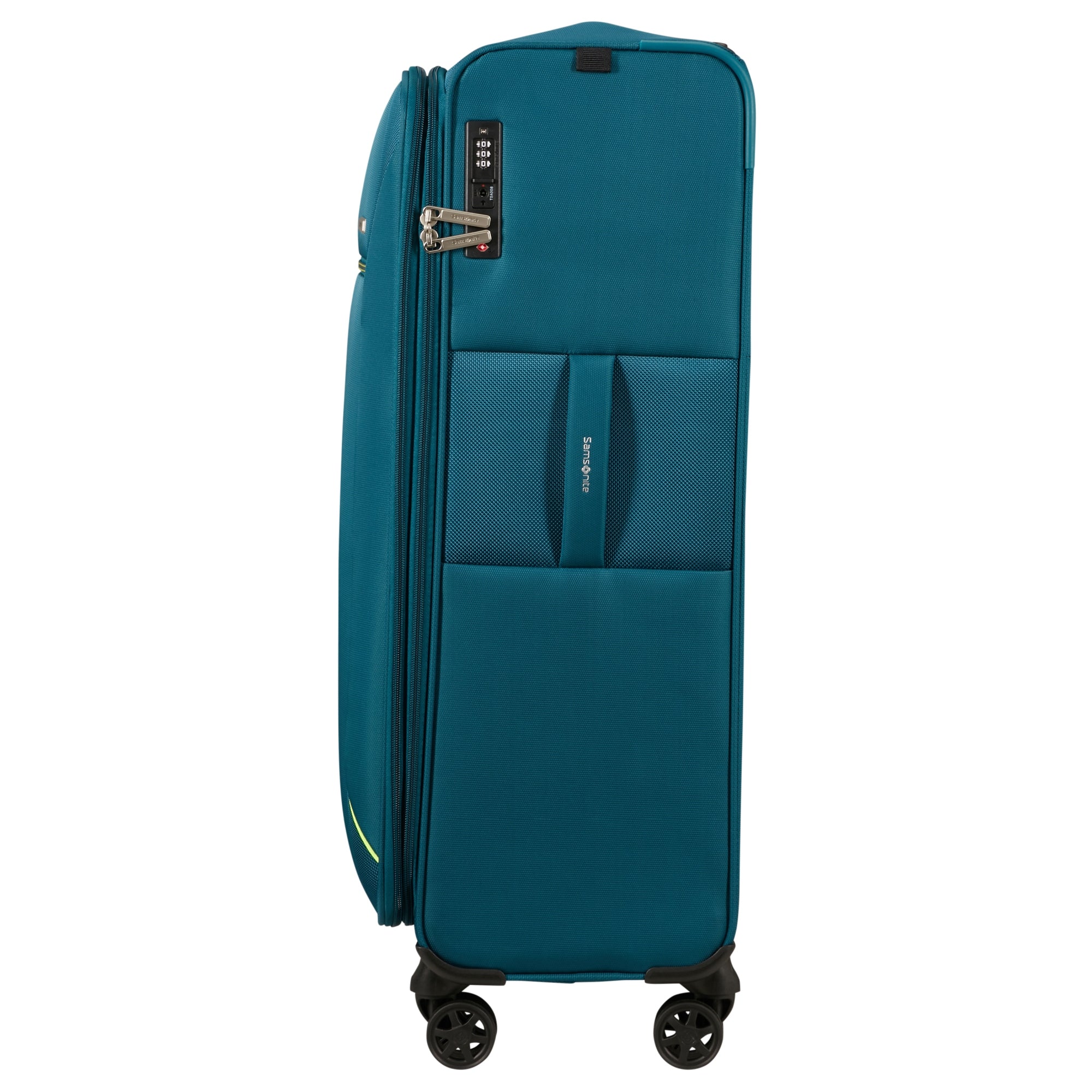Der Samsonite Base Breeze 4-Rollen-Trolley in petrol blue ist ein robuster Begleiter für längere Reisen. Gefertigt aus 100 % recyceltem PET-Polyester verbindet er Nachhaltigkeit mit hoher Strapazierfähigkeit und bietet dabei ein Volumen von 105 l für großzügigen Stauraum.