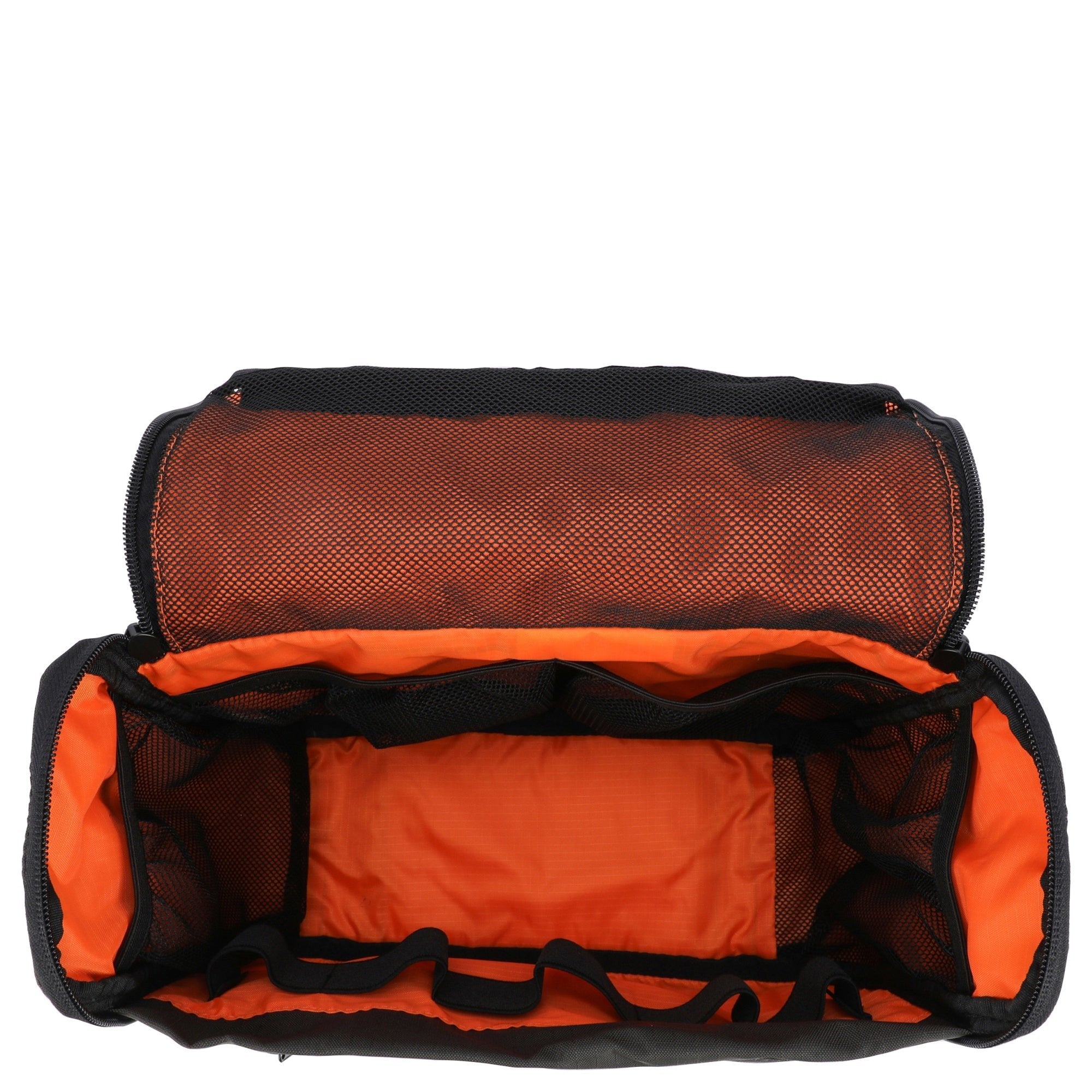 - Répartition polyvalente des compartiments – incluant 5 boucles en caoutchouc, 4 poches filet élastiques et 3 poches filet zippées pour un rangement parfait
