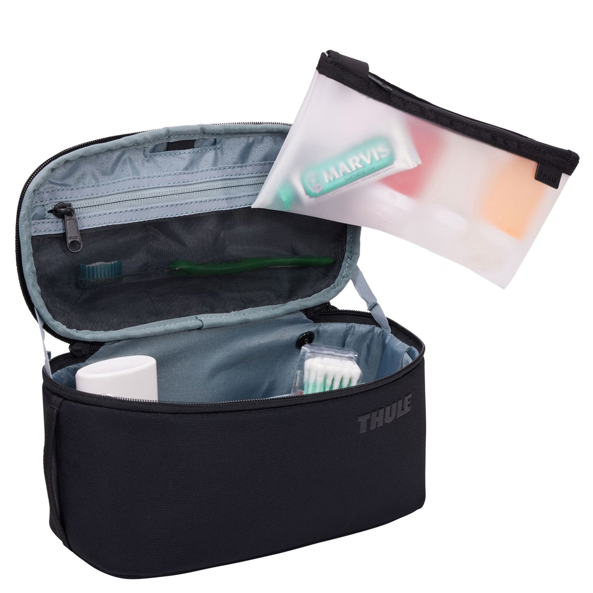 Cette trousse de toilette se distingue par son équipement bien pensé :