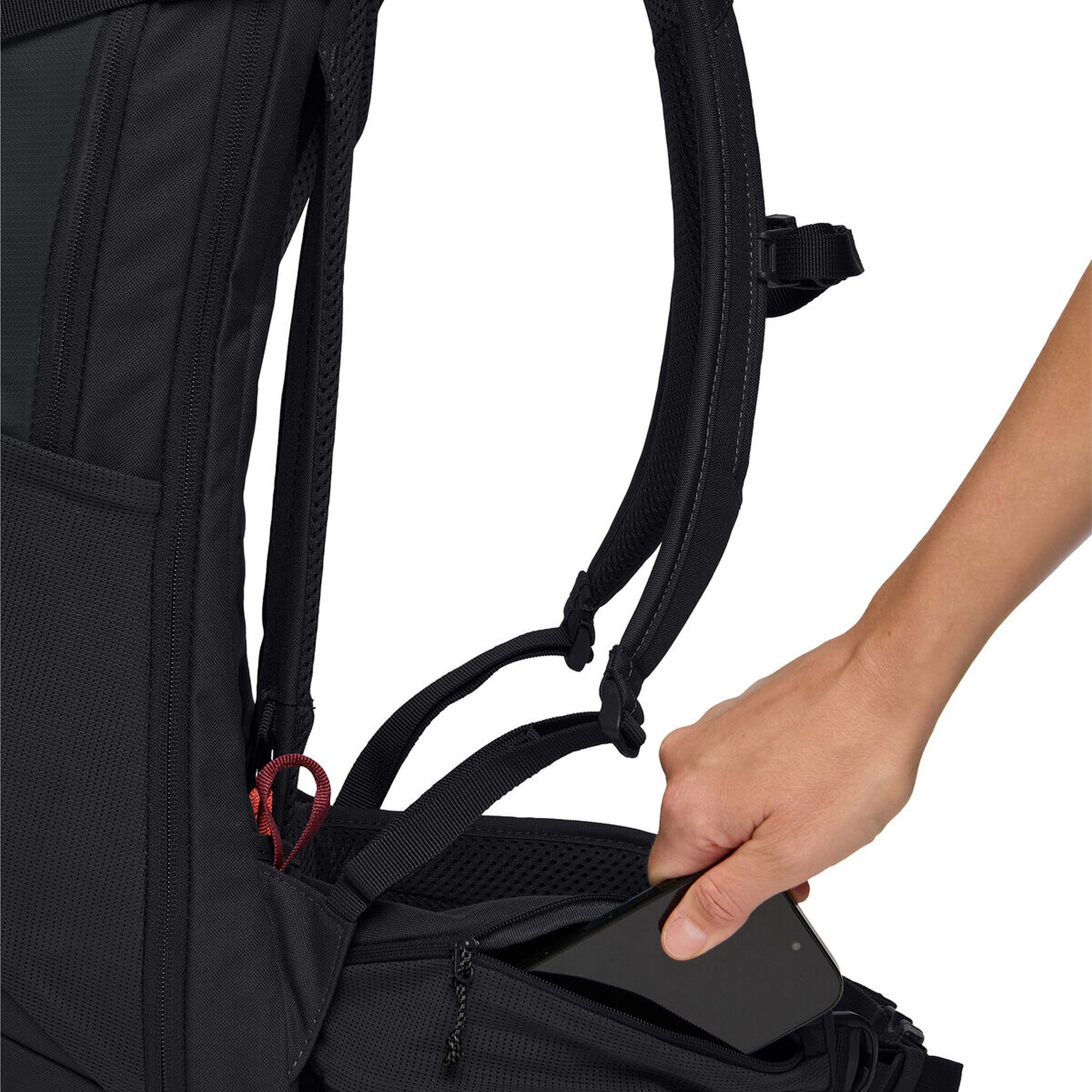 - Équipement pratique – comprenant un organiseur, des poches latérales en filet, un porte-bâtons, une ouverture pour système d’hydratation et une ceinture ventrale rembourrée avec poche zippée